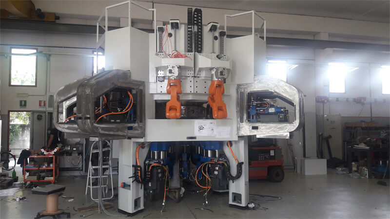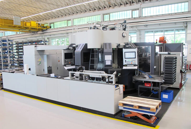 is a compact and versatile configuration that has 12 stations and a horizontal axis indexing table with 12 x 2 jaw chucks for single production and 24 x 2 jaw chucks for double production. Suitable for machining parts in the automotive, plumbing and hydraulic sectors, this machine configuration allows for three-sided simultaneous machining with up to 33 CNC units and can produce parts out of bar or robot-loaded blanks up to 50mm capacity.
